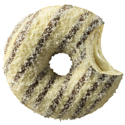 Kokodonut, ktorý každého poblázni! Biela čokoláda ozdobená prúžkami tmavej čoko polevy, posypaná sladkými kokosovými hoblinami a naplnená krémom až po okraj.